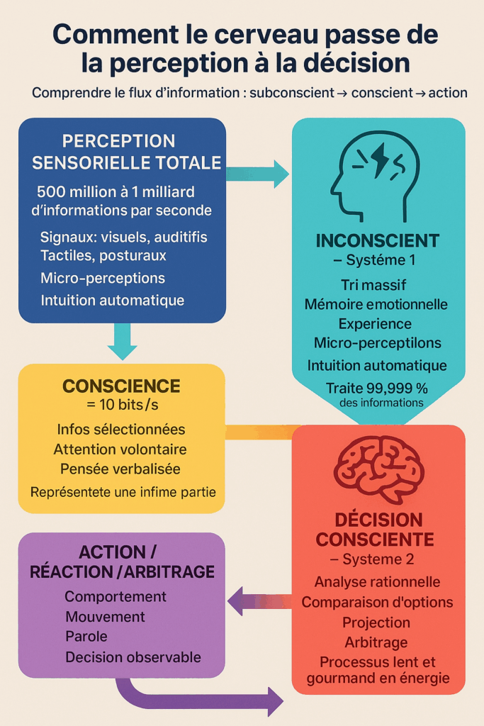 - Ce que nous percevons inconsciemment nourrit l’intuition, le ressenti, les décisions rapides.